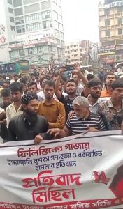 গতকাল দুপুরে উত্তরা রাজলক্ষ্মী কম্পলেক্স এর সামনে ফিলিস্তিনের গাঁজায় ইসরায়েলি হামলা বন্ধে এই বিক্ষোভ সমাবেশ অনুষ্ঠিত হয়।