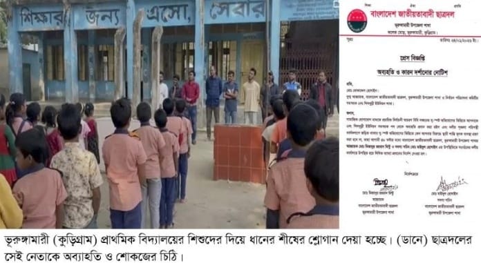 জাতীয় সাপ্তাহিক অন্যায়ের প্রতিবাদ। মোঃ কামরুল হাসান কাজল কুড়িগ্রাম প্রতিনিধিঃ কুড়িগ্রামের ভূরুঙ্গামারী উপজেলার পূর্ব ধলডাঙ্গা সরকারি প্রাথমিক বিদ্যালয়ের শিশুদের দিয়ে ধানের শীষের পক্ষে শ্লোগান দেওয়ার একটি ভিডিও সামাজিক যোগাযোগ মাধ্যমে