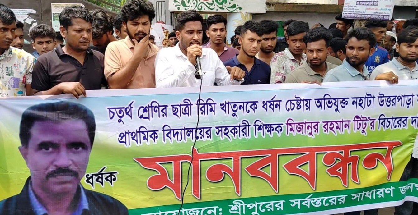 শিক্ষার্থীকে শ্লীলতাহানীতে অভিযুক্ত শিক্ষকের বিচারের দাবিতে মানববন্ধন