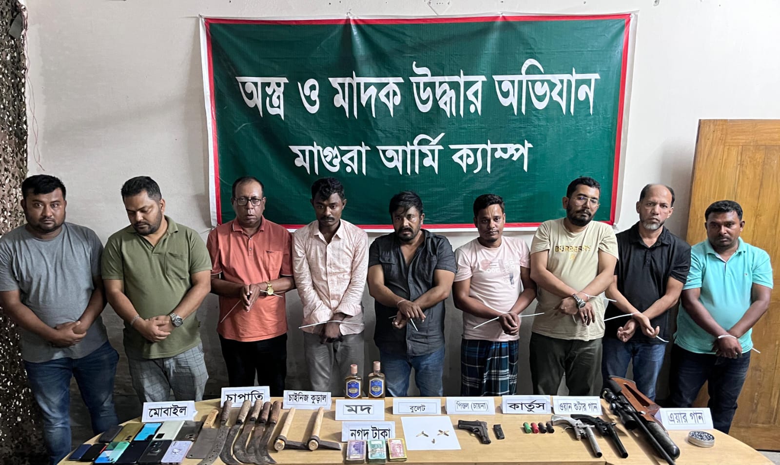 জাতীয় সাপ্তাহিক অন্যায়ের প্রতিবাদ। তৌহিদ, মাগুরা মাগুরা সেনা-ক্যাম্পের গোয়েন্দা কর্তৃক গৃহীত তথ্যের ভিত্তিতে মাগুরার বিশিষ্ট ব্যাবসায়ী ও জেলা চেম্বার অফ কমার্স এর ভারপ্রাপ্ত সভাপতি মোঃ ফরিদ হাসান খাঁন সহ ৭
