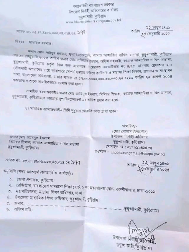 ভূরুঙ্গামারী কামাত আঙ্গারিয়া দাখিল মাদ্রাসার সুপার ফৌজদারি মামলায় কারাগারে থাকায় সাময়িক বরখাস্ত