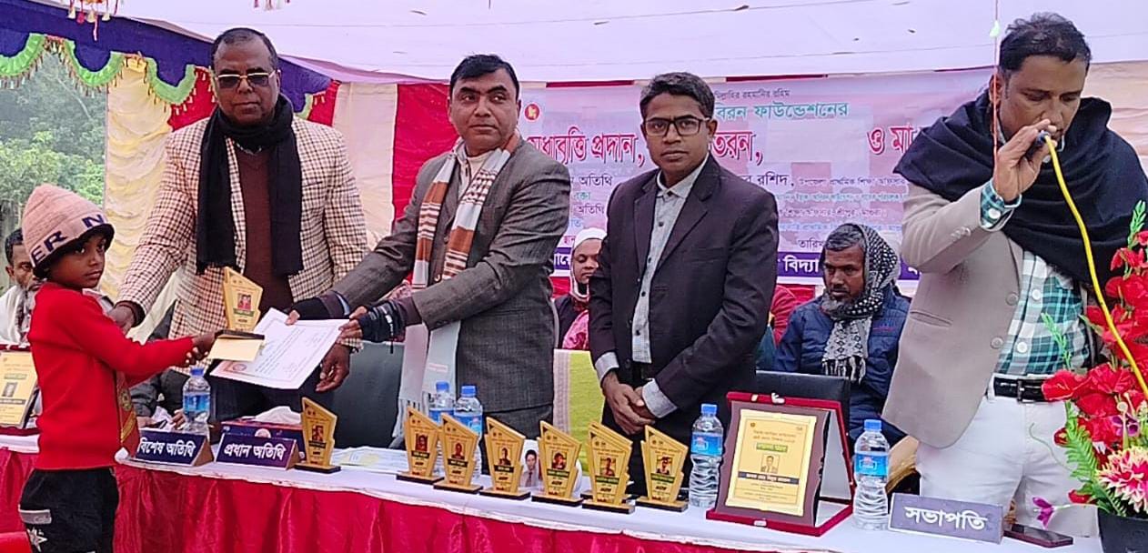 জাতীয় সাপ্তাহিক অন্যায়ের প্রতিবাদ। তৌহিদ, মাগুরা মাগুরা জেলার শ্রীপুর উপজেলার স্বেচ্ছাসেবী সংগঠন ইছাক-আবিরন ফাউন্ডেশনের উদ্যোগে দোসতিনা সরকারি প্রাথমিক বিদ্যালয়ের শিক্ষার্থীদের মাঝে মেধাবৃত্তি, সার্টিফিকেট, শীতবস্ত্র (রঙিন সোয়েটার) ও স্কুল ব্যাগ বিতরণ