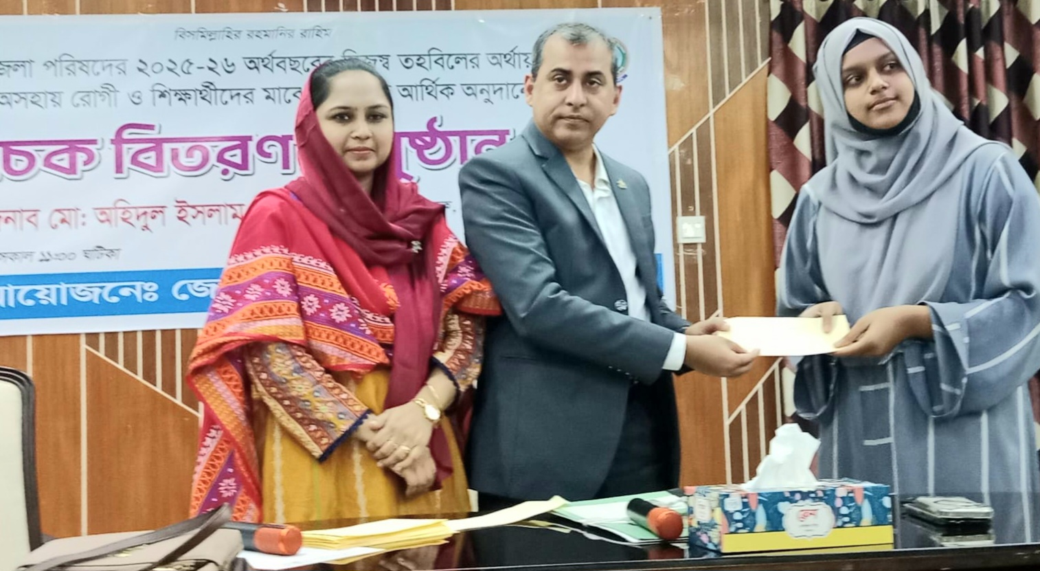 জেলা পরিষদের অর্থায়নে দুস্থ ও অসহায় রোগী এবং শিক্ষার্থীদের মাঝে আর্থিক অনুদানের চেক বিতরণ।