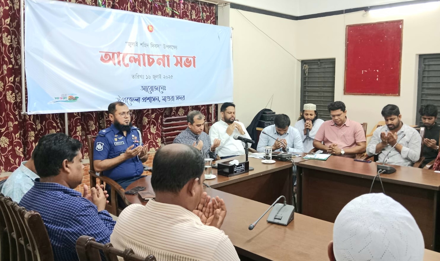 জাতীয় সাপ্তাহিক অন্যায়ের প্রতিবাদ। তৌহিদ মাগুরা। মাগুরাতে ‘জুলাই শহীদ দিবস’ -২০২৫ উপলক্ষে আলোচনা সভা অনুষ্টিত হয়েছে। বুধবার ১৬ জুলাই সকালে মাগুরা সদর উপজেলা নির্বাহী অফিসার মোঃ হাসিবুল হাসানের সভাপতিত্বে উপজেলা
