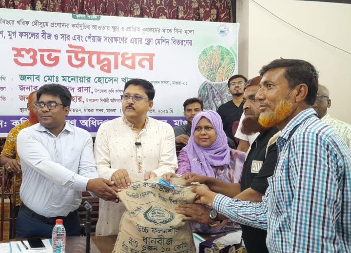 জাতীয় সাপ্তাহিক অন্যায়ের প্রতিবাদ। তৌহিদ, মাগুরা। মাগুরায় ২০২৫-২৬ অর্থ বছরে খরিফ মৌসুমী প্রণোদনা কর্মসূচির আওতায় ক্ষুদ্র ও প্রান্তিক কৃষকদের মাঝে উফশী আউশ,মুগ ফসলের বীজ ও সার এবং পেঁয়াজ সংরক্ষণের এয়ার
